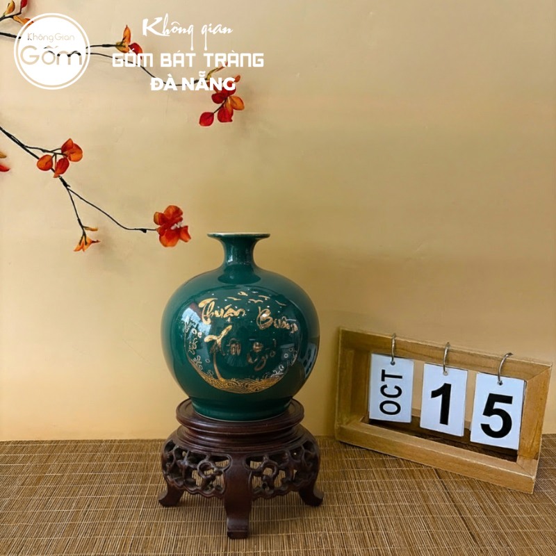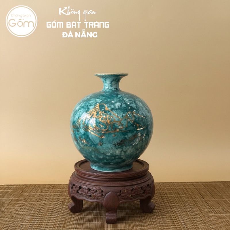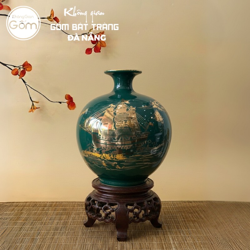Trên thân bình, những họa tiết ý nghĩa như con thuyền căng buồm vượt sóng hay đóa sen thanh khiết được vẽ hoàn toàn bằng vàng kim thật. Từng đường nét vàng lấp lánh, tương phản với màu men chủ đạo, không chỉ tạo nên vẻ đẹp cuốn hút mà còn trực tiếp gửi gắm lời chúc “Thuận buồm xuôi gió” hay sự bình an, may mắn đến người nhận. Đây là món quà hiện đại, giá trị, đặc biệt phù hợp để dành tặng đối tác, bạn bè trong các dịp khai trương hay tân gia.