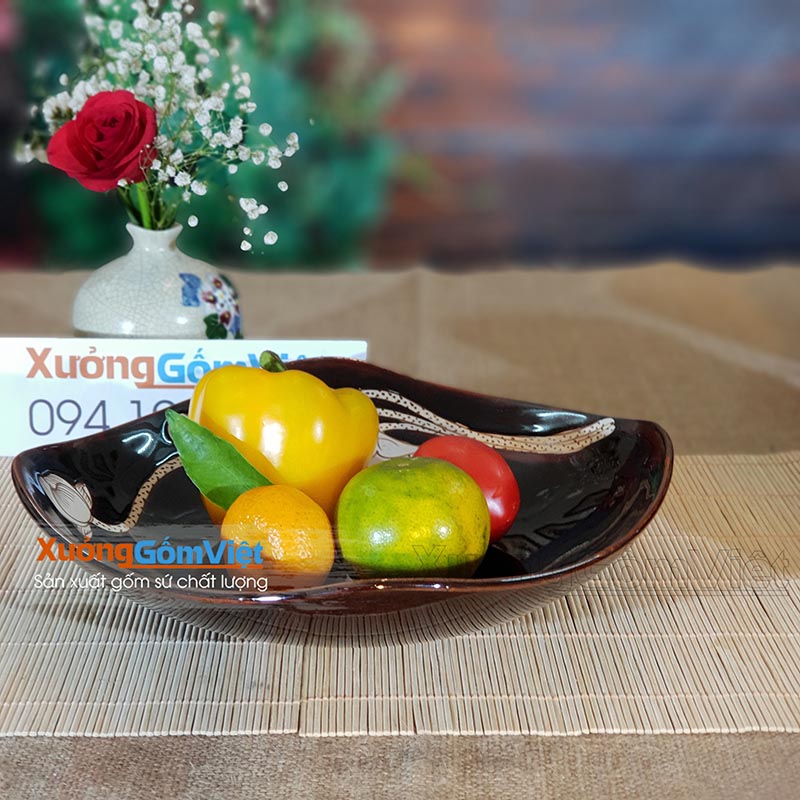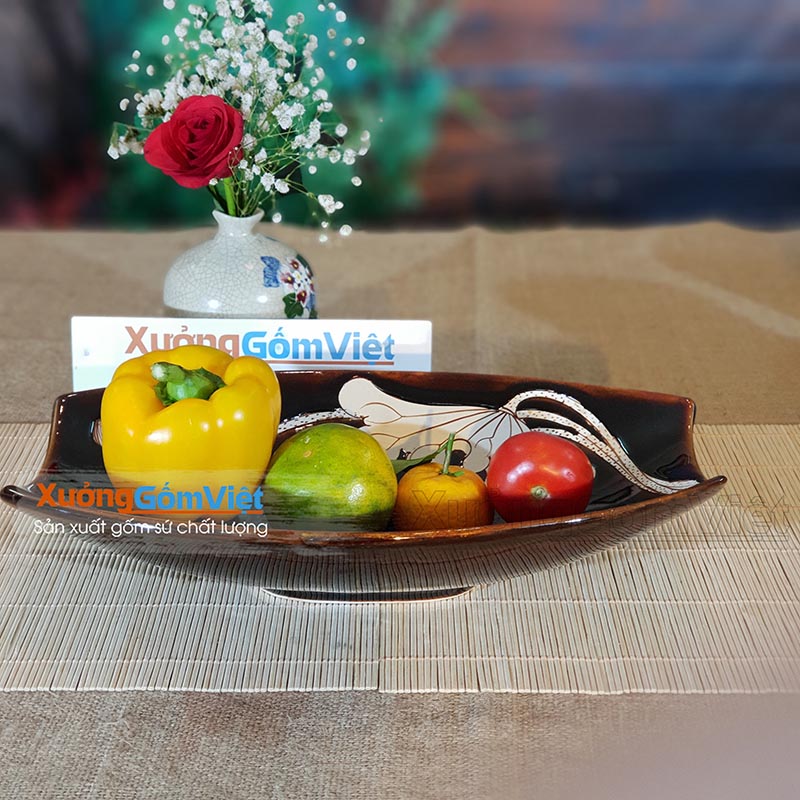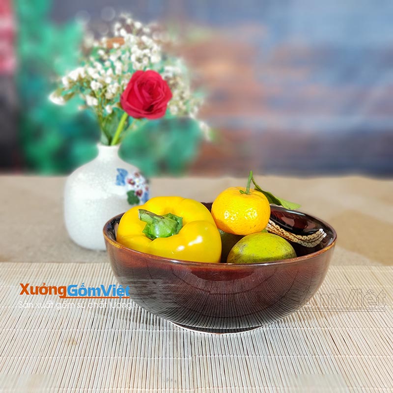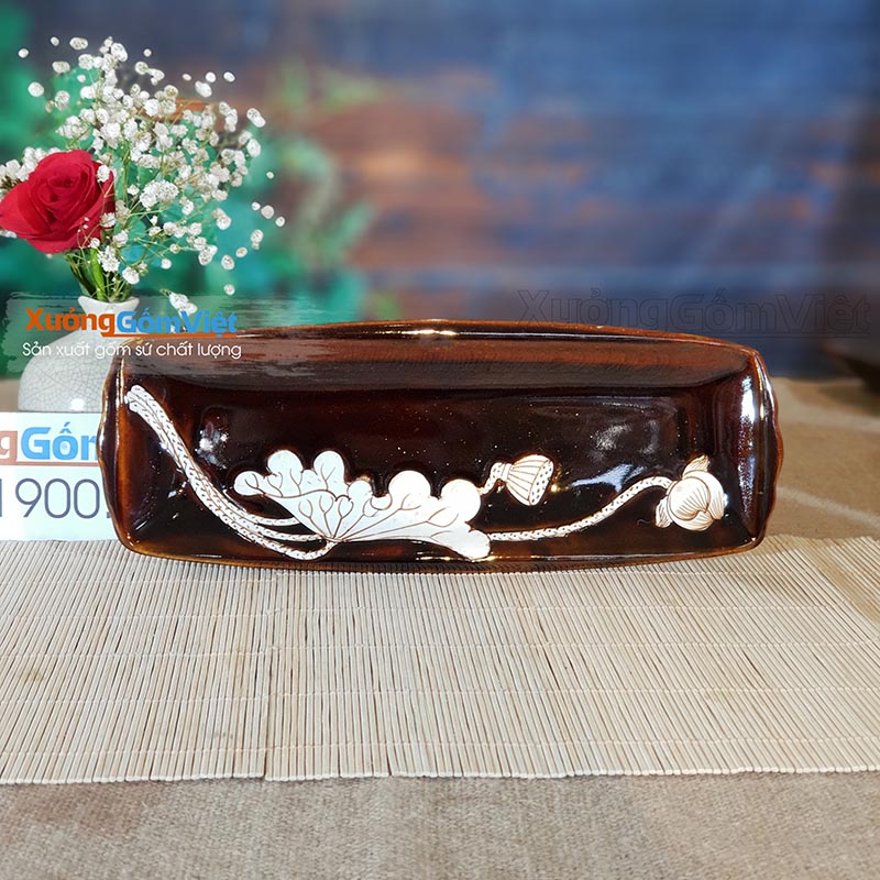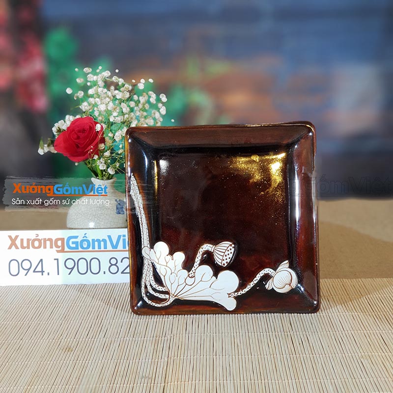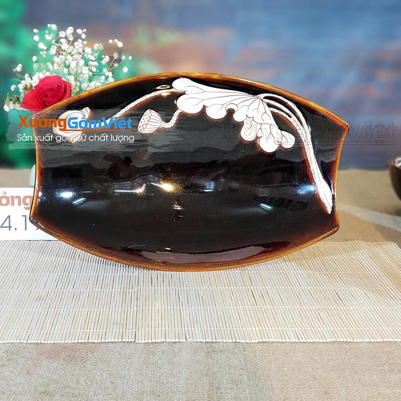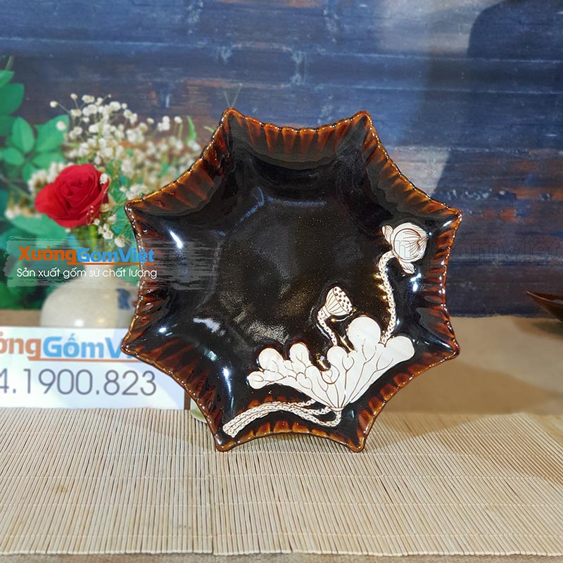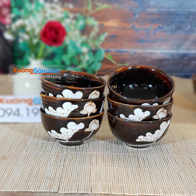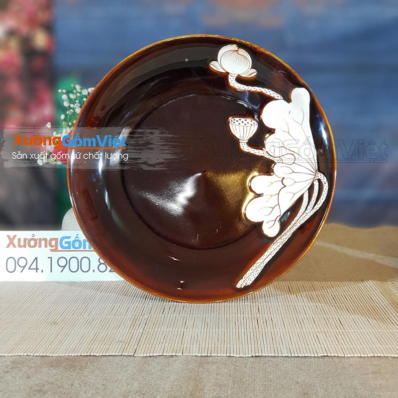 Bộ bát đĩa vẽ sen men nâu Tây sang trọng