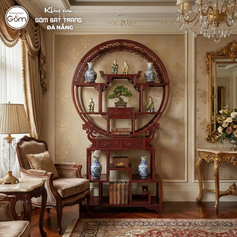 Tại đại sảnh lớn, không gian trưng bày nghệ thuật hoặc phòng khách rộng, kệ dáng nguyệt là lựa chọn ưu tiên. Thiết kế bề thế của mẫu kệ này giúp tôn vinh trọn vẹn giá trị của các bộ sưu tập gốm sứ quý giá, tạo ấn tượng mạnh mẽ về sự sang trọng ngay từ cái nhìn đầu tiên.