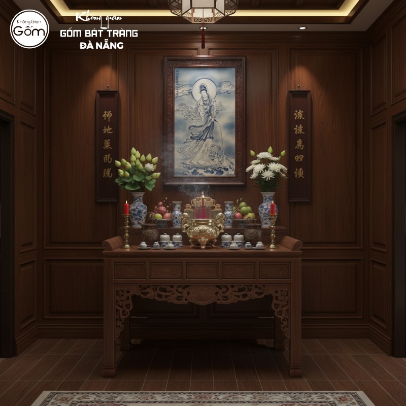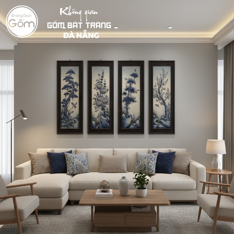 Không gian Gốm Bát Tràng Đà Nẵng luôn có sẵn những mẫu tranh gốm sứ men lam, men rạn tinh tế, rất phù hợp cho không gian phòng thờ: