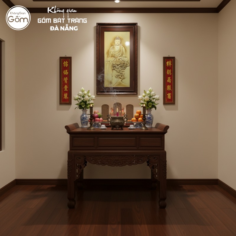Không gian thờ cúng là nơi linh thiêng, trang nghiêm nhất trong nhà, vì vậy việc chọn tranh trang trí cần thể hiện được sự tôn kính và thanh tịnh. Tranh gốm sứ với những chủ đề trang nhã, màu sắc trầm ấm chính là sự lựa chọn hoàn hảo để không gian này thêm phần ấm cúng mà vẫn giữ được vẻ tôn nghiêm cần có.
