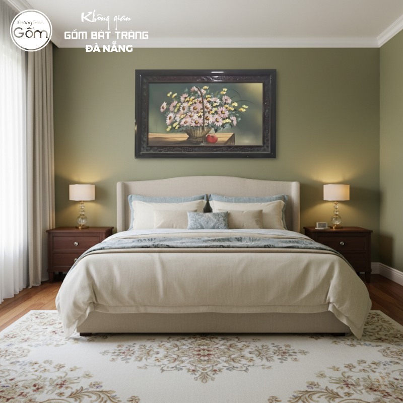 Phòng ngủ là không gian nghỉ ngơi, thư giãn sau một ngày dài, do đó những bức tranh có chủ đề nhẹ nhàng, màu sắc hài hòa sẽ giúp bạn có được cảm giác thư thái và một giấc ngủ ngon. Tranh gốm sứ với các họa tiết từ thiên nhiên, hoa lá sẽ là lựa chọn tuyệt vời, mang đến sự dễ chịu cho không gian riêng tư của bạn.
