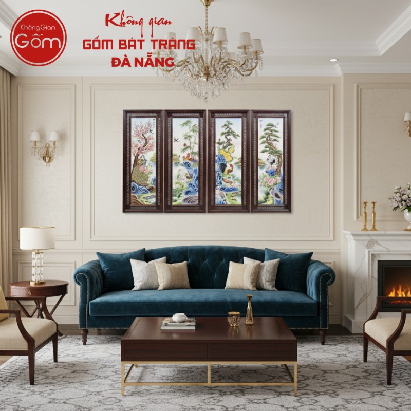 Phòng khách được xem là là bộ mặt của cả ngôi nhà, vì vậy việc trang trí không gian này luôn được các gia chủ đặc biệt quan tâm. Một bức tranh gốm sứ với chủ đề và kích thước phù hợp sẽ trở thành điểm nhấn ấn tượng, thu hút mọi ánh nhìn và mang lại vượng khí cho gia đình.