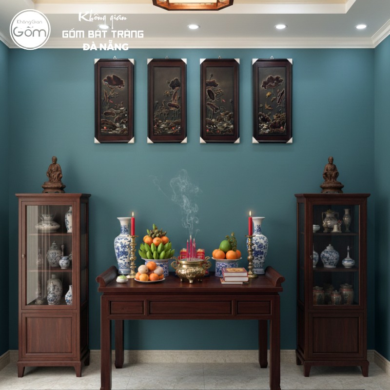 Không gian Gốm Bát Tràng Đà Nẵng luôn có sẵn những mẫu tranh gốm sứ men lam, men rạn tinh tế, rất phù hợp cho không gian phòng thờ: