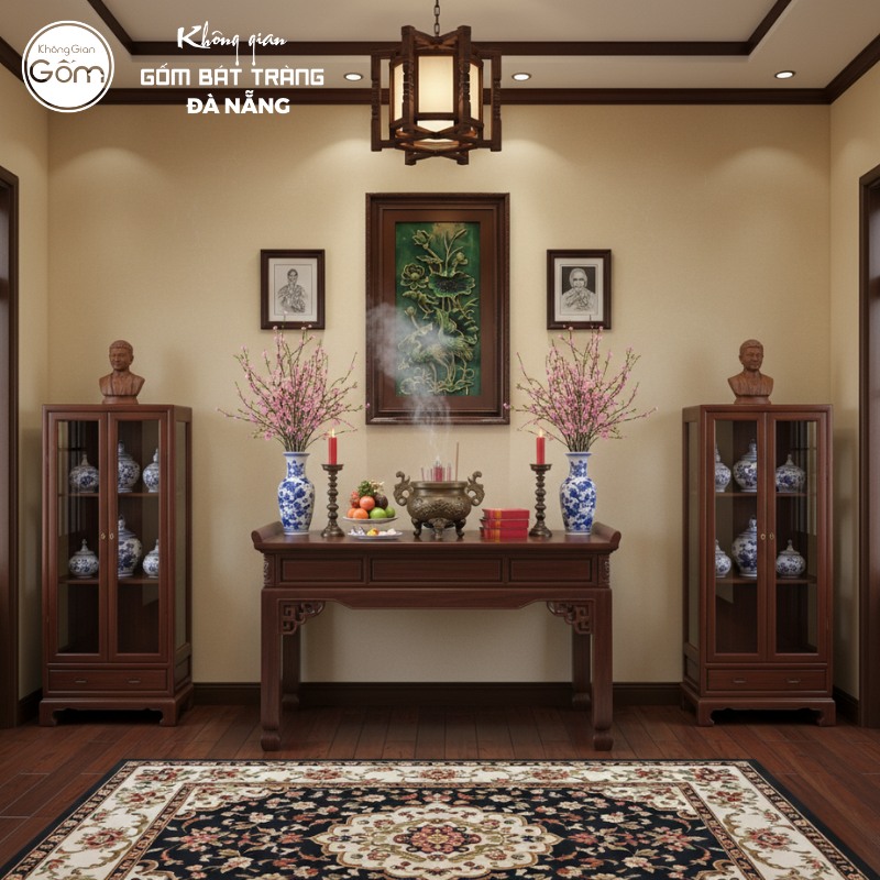 Không gian thờ cúng là nơi linh thiêng, trang nghiêm nhất trong nhà, vì vậy việc chọn tranh trang trí cần thể hiện được sự tôn kính và thanh tịnh. Tranh gốm sứ với những chủ đề trang nhã, màu sắc trầm ấm chính là sự lựa chọn hoàn hảo để không gian này thêm phần ấm cúng mà vẫn giữ được vẻ tôn nghiêm cần có.