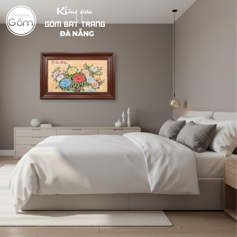Phòng ngủ là không gian nghỉ ngơi, thư giãn sau một ngày dài, do đó những bức tranh có chủ đề nhẹ nhàng, màu sắc hài hòa sẽ giúp bạn có được cảm giác thư thái và một giấc ngủ ngon. Tranh gốm sứ với các họa tiết từ thiên nhiên, hoa lá sẽ là lựa chọn tuyệt vời, mang đến sự dễ chịu cho không gian riêng tư của bạn.