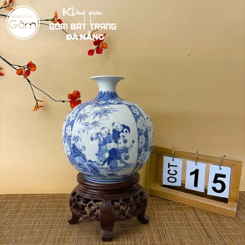 - Bình hút lộc men lam bách nhi: Họa tiết “Bách Nhi Đồ” (trăm đứa trẻ vui đùa) là biểu tượng của phúc khí, con đàn cháu đống, gia đình hòa thuận. Đặt bình này ở phòng khách mang ý nghĩa cầu mong một gia đình luôn tràn ngập tiếng cười, thế hệ sau tài giỏi và hiếu thảo.