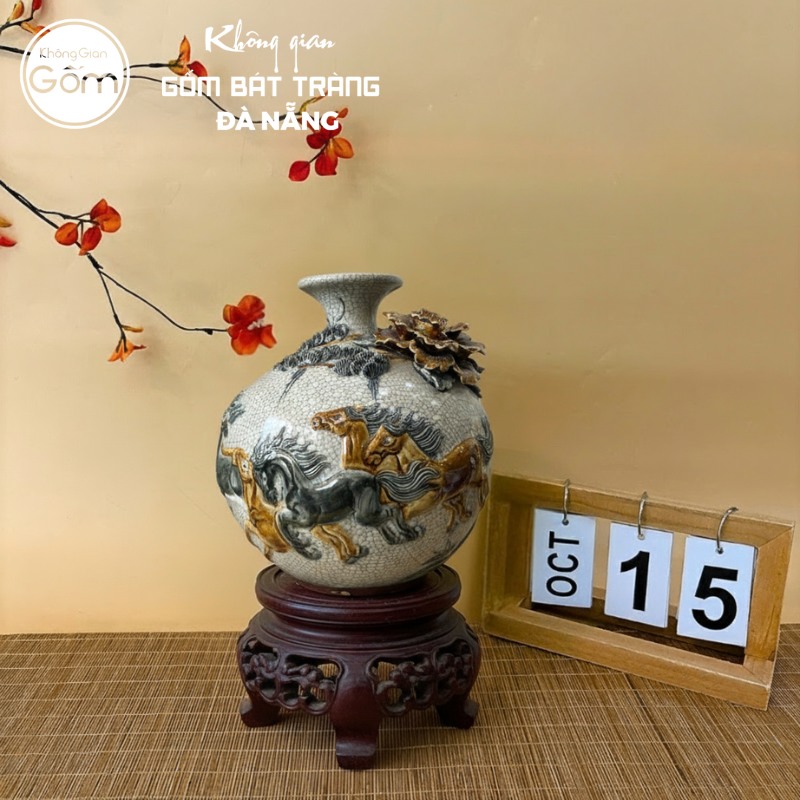 - Bình hút lộc men rạn đắp nổi: Vẻ đẹp mộc mạc, cổ kính và trang nghiêm của dòng men rạn đắp nổi rất phù hợp với không gian phòng thờ. Các họa tiết đắp nổi thường là Tứ linh, hoa sen… mang ý nghĩa tâm linh sâu sắc, thể hiện lòng thành kính của con cháu đối với ông bà, tổ tiên.