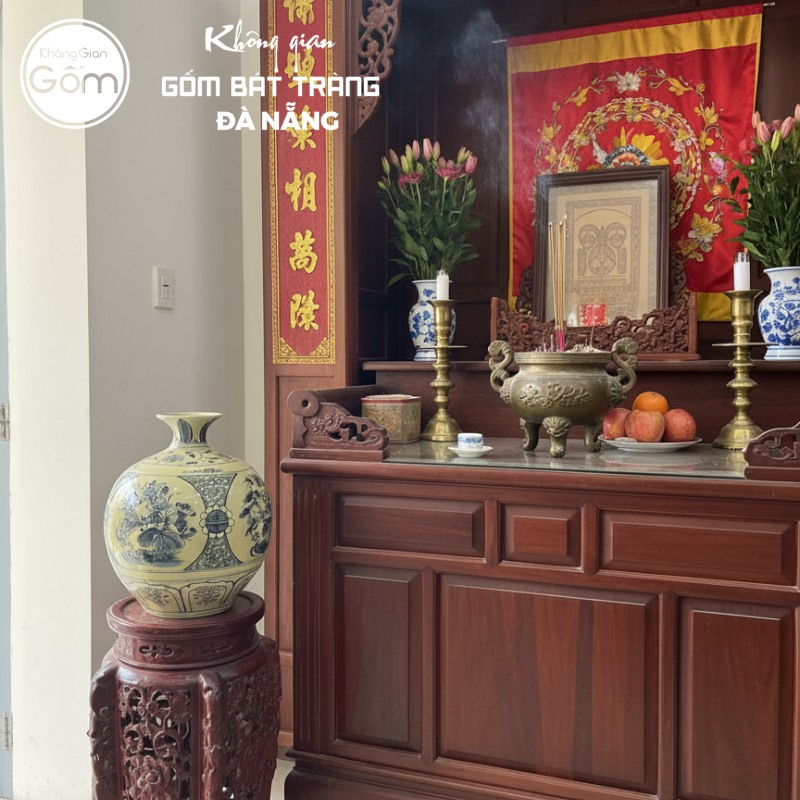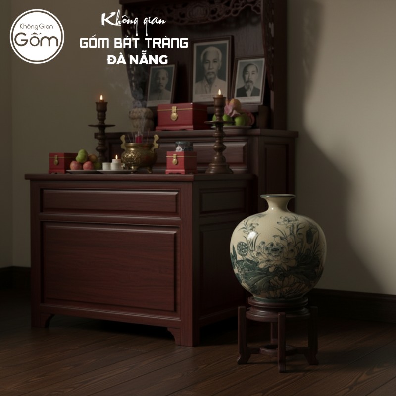 Bình hút lộc có thể được đặt ở hai bên bàn thờ một cách đối xứng để tạo sự cân bằng, hoặc đặt một bình theo nguyên tắc “Đông bình Tây quả” (bên trái đặt bình hoa, bên phải đặt đĩa quả). Dù đặt một hay hai bình, cũng cần đảm bảo sự trang trọng, sạch sẽ, thể hiện tấm lòng thành kính của gia chủ. Sự hiện diện của bình hút lộc gốm sứ Bát Tràng khiến không gian thờ tự thêm phần ấm cúng và vẹn tròn.
