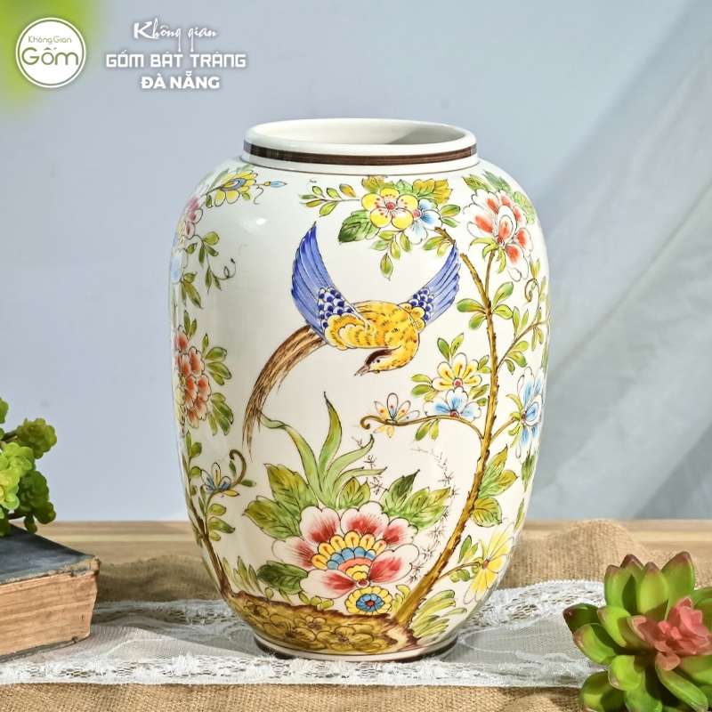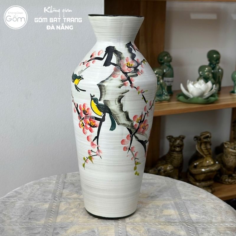 Tại 2 showroom Không Gian Gốm Bát Tràng Đà Nẵng, mẫu bình họa tiết vẽ tay luôn nằm trong danh mục tìm kiếm hàng đầu của các chị em. Những hình ảnh chim cành, hoa lá được nghệ nhân vẽ thủ công sinh động, mang đến vẻ đẹp nghệ thuật cho cành đào ngày Tết.