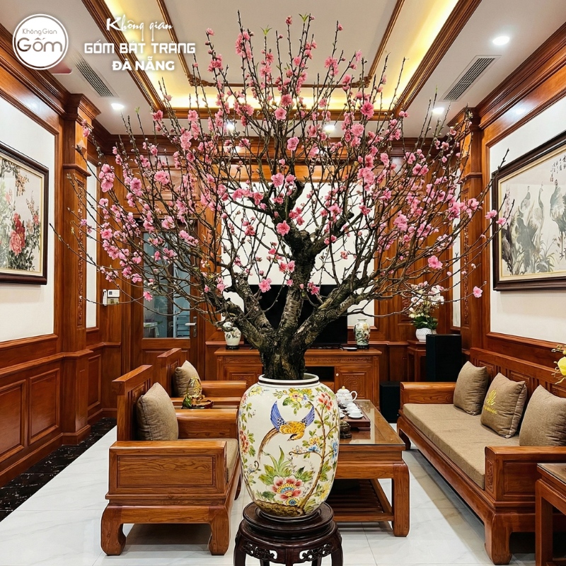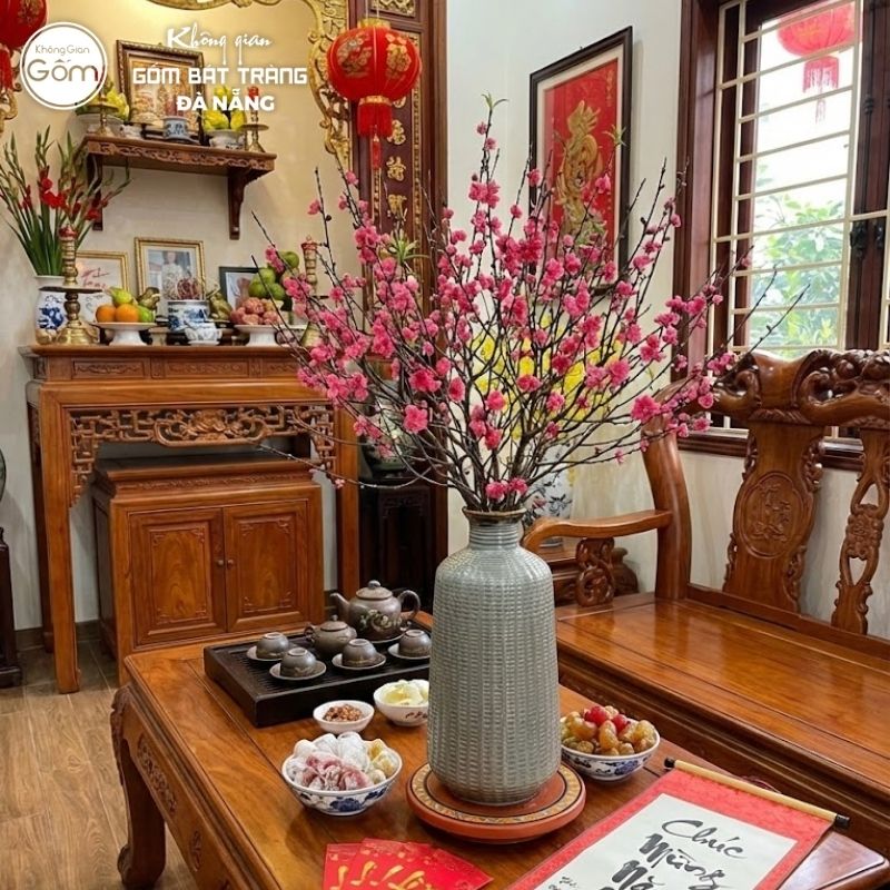 • Không gian nhà ở truyền thống: Với không gian nội thất gỗ, các mẫu bình hoa men rạn hoặc men lam cổ điển sẽ rất phù hợp. Sự kết hợp này mang lại không khí ấm cúng, trang trọng và đậm chất Tết cổ truyền.