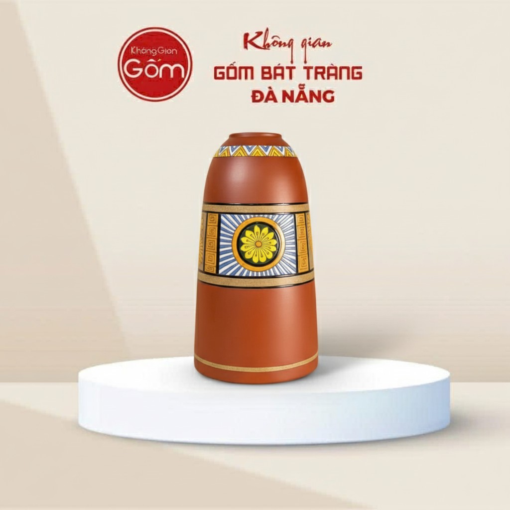 Bình hoa đất nung dáng chuông họa tiết thổ cẩm được nhiều khách hàng lớn tuổi tại Đà Nẵng ưa chuộng cho dịp Tết 2026