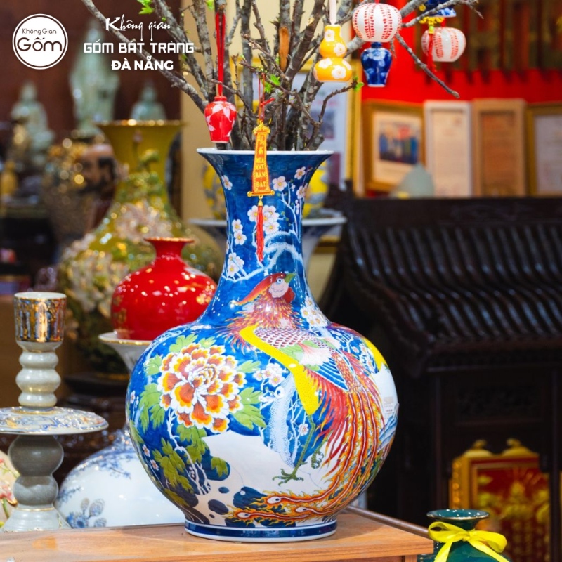 Khi đến với cửa hàng Không Gian Gốm Bát Tràng tại Đà Nẵng, bạn có thể thỏa thích lựa chọn những mẫu bình đùi dế với họa tiết vẽ màu sống động hoặc các dòng vẽ vàng tinh xảo. Những đường nét vẽ sinh động trên nền gốm không chỉ làm nổi bật sắc hồng của hoa đào mà còn làm bừng sáng cả góc trưng bày trong những ngày đầu năm mới.