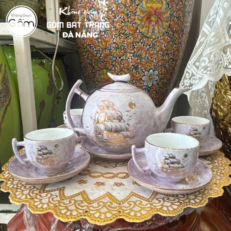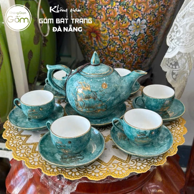 Bộ ấm chén Bát Tràng men vân đá họa tiết thuận buồm xuôi gió vàng kim ấn tượng thích hợp tặng doanh nhân