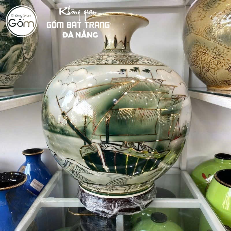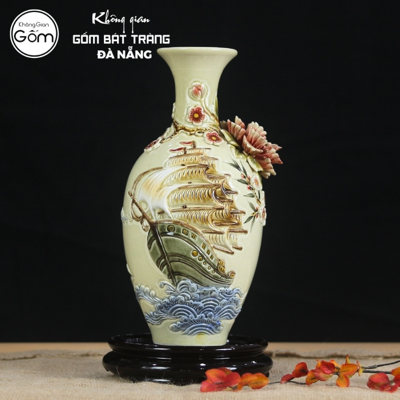 Dáng mai bình thanh thoát, uyển chuyển kết hợp với họa tiết thuyền buồm căng gió tạo nên một vật phẩm vừa có giá trị thẩm mỹ, vừa mang ý nghĩa phong thủy sâu sắc. Đặt chiếc mai bình này trong phòng làm việc tựa như một lời chúc cho mọi dự định, kế hoạch của sếp đều hanh thông, suôn sẻ và gặt hái thành công rực rỡ.
