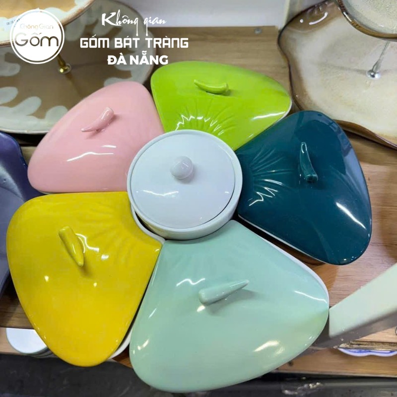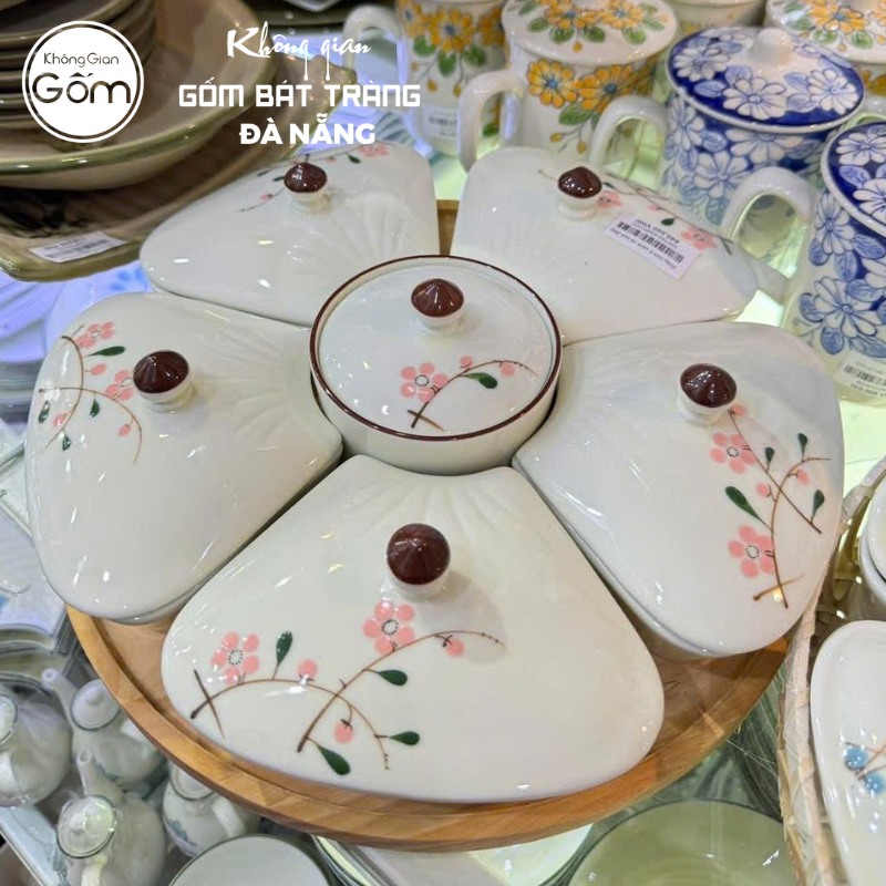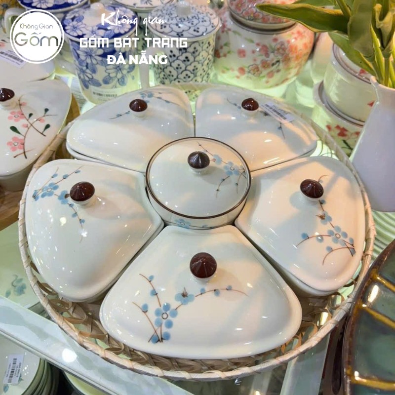 - Khay mứt: Một chiếc khay mứt gốm sứ cao cấp sẽ làm bàn trà ngày Tết của gia đình sếp thêm sang trọng và ấm cúng. Bạn có thể chọn các mẫu như khay mứt 5 cánh hoa, bộ hũ mứt tròn hay khay mứt hình tổ ong độc đáo.