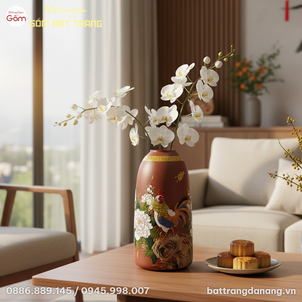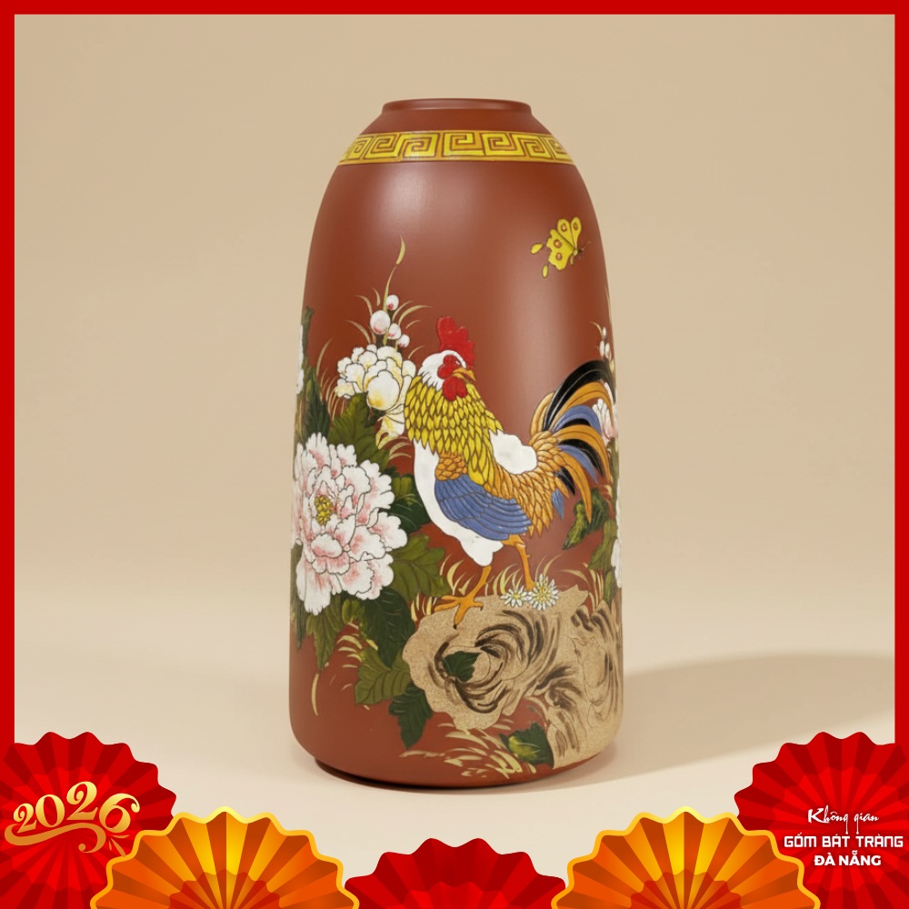 Mỗi chi tiết trên bình đều mang theo thông điệp phong thủy tích cực: gà trống đại diện cho sự uy dũng, xua đuổi tà khí và thu hút tài lộc, trong khi hoa mẫu đơn là biểu tượng của sự phú quý, hạnh phúc và tình duyên viên mãn. Sự kết hợp này mang đến một vật phẩm đẹp, kiến tạo năng lượng tích cực cho không gian sống.