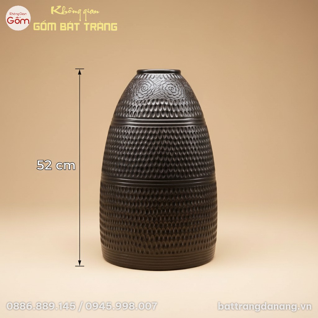 - Kích thước lý tưởng: Với chiều cao 52cm, đường kính miệng 13cm và đường kính đáy 29cm, bình có dáng chuông phình nhẹ ở thân dưới và thuôn dần về phía miệng, tạo sự cân đối hoàn hảo cho việc cắm các loại hoa có cành dài, nhiều nhánh.