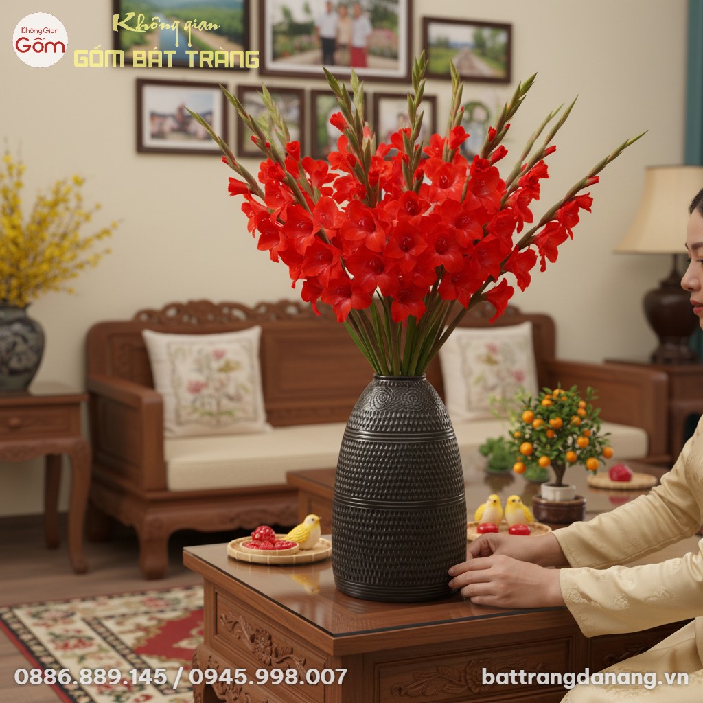 - Cắm hoa đa dạng: Dáng chuông của bình đặc biệt phù hợp để cắm các loại hoa có cành dài, nhiều nhánh như hoa đào, hoa mận, tuyết mai vào dịp Tết, hay những bó ly, hướng dương, hoa hồng, hoa dơn rực rỡ hàng ngày. Sự tương phản giữa sắc hoa tươi tắn và nền men đen trầm mặc sẽ tạo nên một bức tranh nghệ thuật sống động.