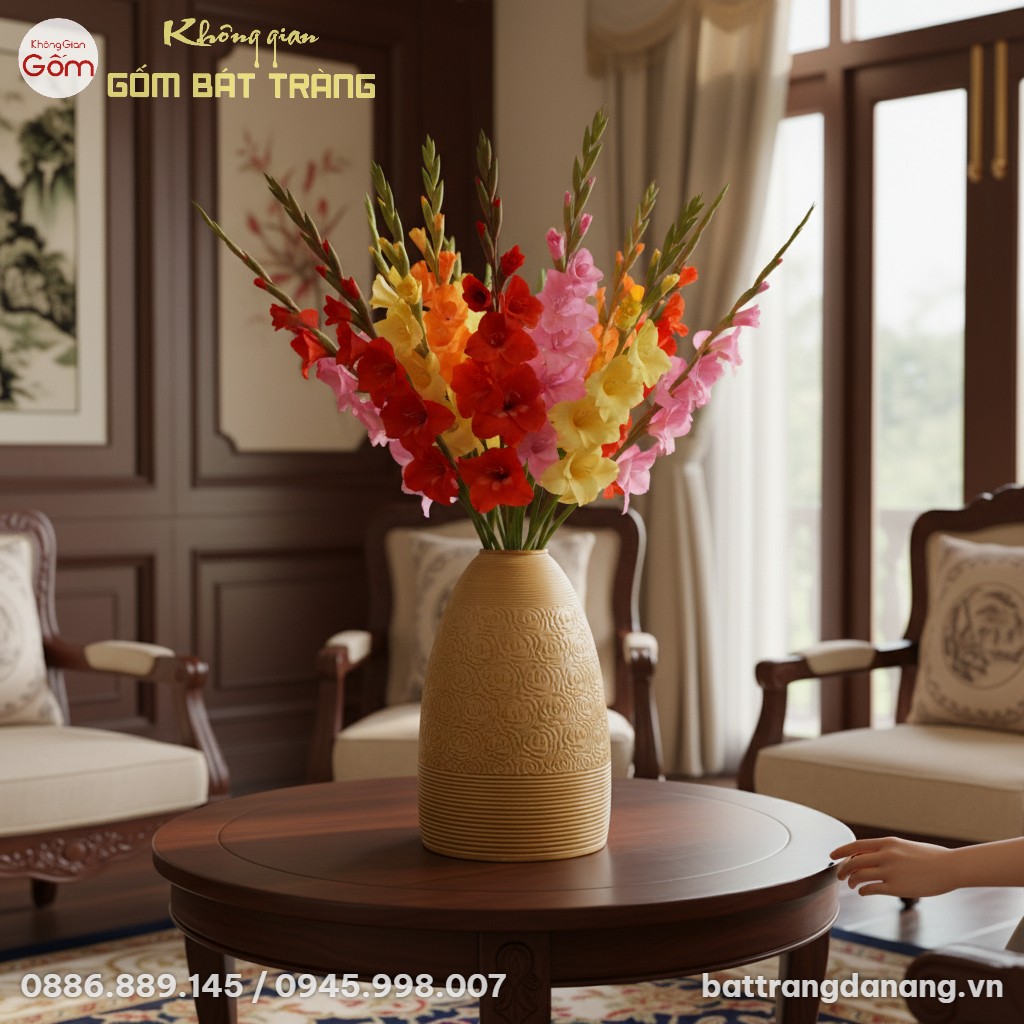 Dù đặt ở phòng khách, phòng ăn, hay sảnh chờ, chiếc bình này đều dễ dàng hòa mình vào tổng thể kiến trúc, từ phong cách tối giản hiện đại đến những không gian mang hơi hướng mộc mạc, truyền thống. Đây là một món đồ trang trí độc đáo, mang dấu ấn thủ công và giá trị văn hóa Bát Tràng, khẳng định gu thẩm mỹ tinh tế của gia chủ.