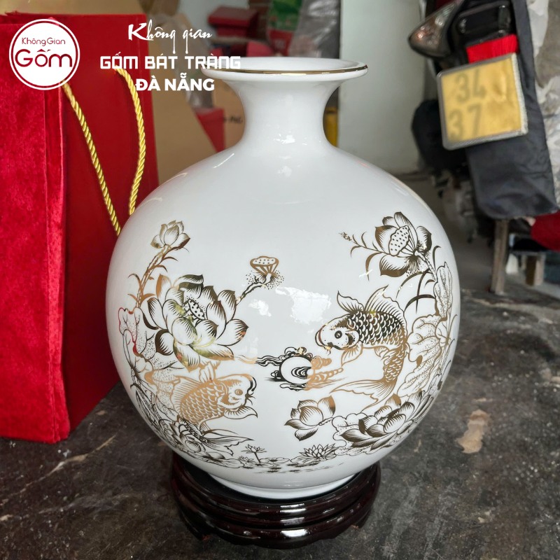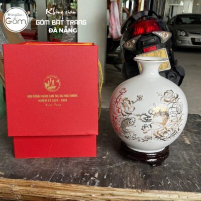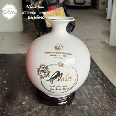 Hơn nữa, mỗi chiếc bình tụ bảo tại Không gian Gốm Bát Tràng Đà Nẵng đều được tuyển chọn từ chất liệu gốm sứ Bát Tràng loại I, nổi bật với men trắng bóng và họa tiết cá chép hoa sen, chữ Phúc vẽ vàng kim thủ công đầy ý nghĩa. Bên cạnh đó, khả năng cá nhân hóa với dấu ấn thương hiệu riêng biệt sẽ kiến tạo một ấn phẩm kỷ niệm giá trị, gửi gắm thông điệp thịnh vượng và may mắn đến đối tác, khách hàng.
