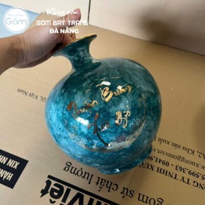- Màu sắc: Nền men xanh ngọc bích vân đá đặc trưng, với hiệu ứng loang tự nhiên như vân ngọc, tạo vẻ đẹp sang trọng và khác biệt. Miệng bình được viền vàng kim tinh xảo, tăng thêm phần quý phái.