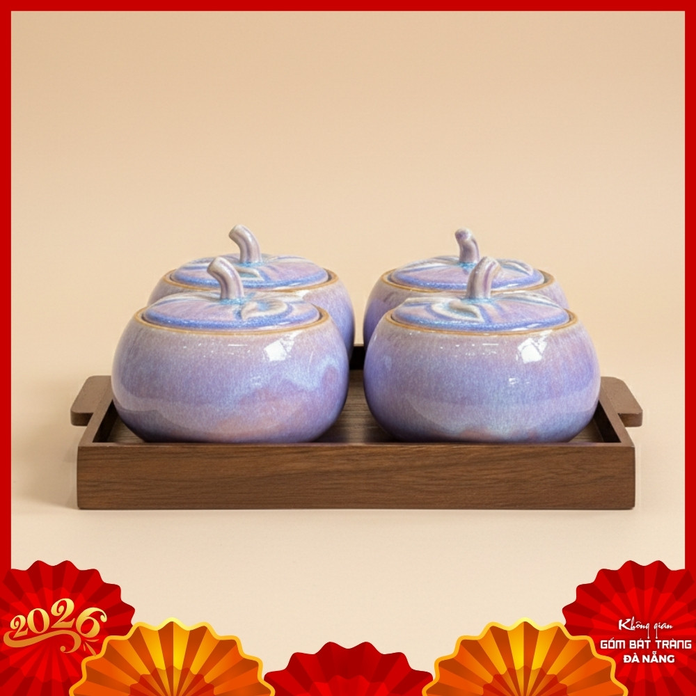 Bộ 4 Hũ Mứt Quả Bí Men Hỏa Biến Kèm Khay Gỗ BT-HM21 là một tác phẩm nghệ thuật tinh xảo, hòa quyện giữa vẻ đẹp truyền thống và hơi thở hiện đại, mang đến sự sang trọng và ấm cúng cho không gian đón Tết của mỗi gia đình Việt.