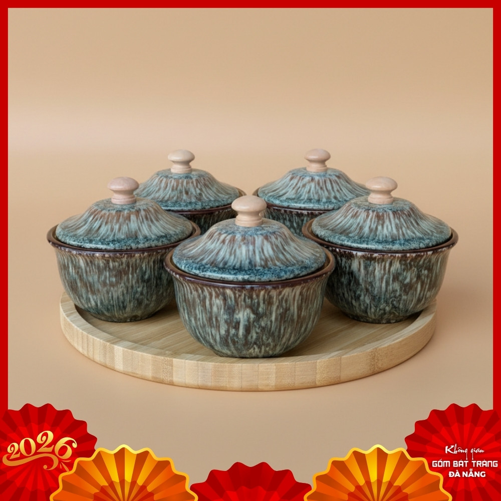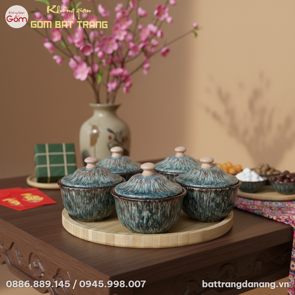 Bộ 5 Hũ Mứt Uyển Lam Men Hỏa Biến Kèm Khay Gỗ BT-HM31 là biểu tượng của sự tinh tế và ấm áp, được chế tác thủ công từ làng nghề gốm sứ Bát Tràng danh tiếng. Sản phẩm này là vật dụng trang trí tinh tế, một điểm nhấn nghệ thuật độc đáo, khơi nguồn cho những câu chuyện sum vầy, ngọt ngào trong mỗi dịp Tết đến xuân về.