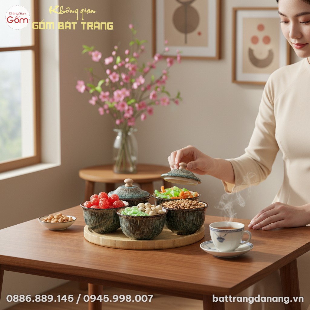 Ngoài chức năng chính là đựng mứt, bánh kẹo ngày Tết, bộ hũ gốm này còn là một vật trang trí nội thất độc đáo, phù hợp với nhiều phong cách từ mộc mạc, Á Đông đến hiện đại. Bạn có thể bài trí chúng trên bàn trà phòng khách, bàn ăn hoặc kệ tủ, tạo điểm nhấn nghệ thuật cho không gian sống.