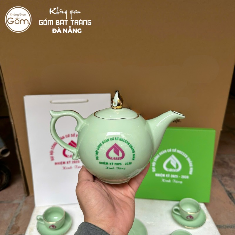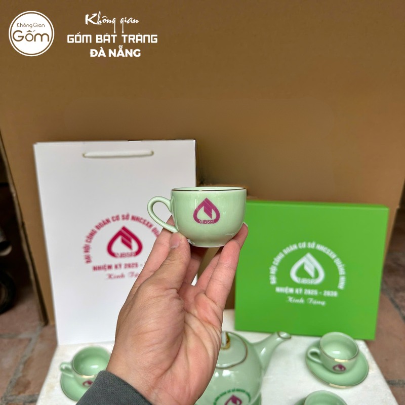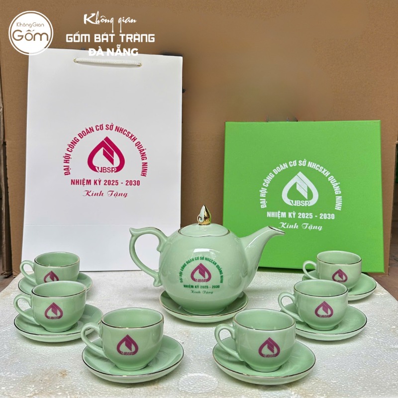 - Họa tiết in logo tùy chỉnh: Logo của Đại hội Công đoàn NHCSXH Quảng Ninh được in rõ nét trên ấm và chén, khẳng định dấu ấn riêng của tổ chức và sự kiện, đồng thời đảm bảo độ bền màu theo thời gian.