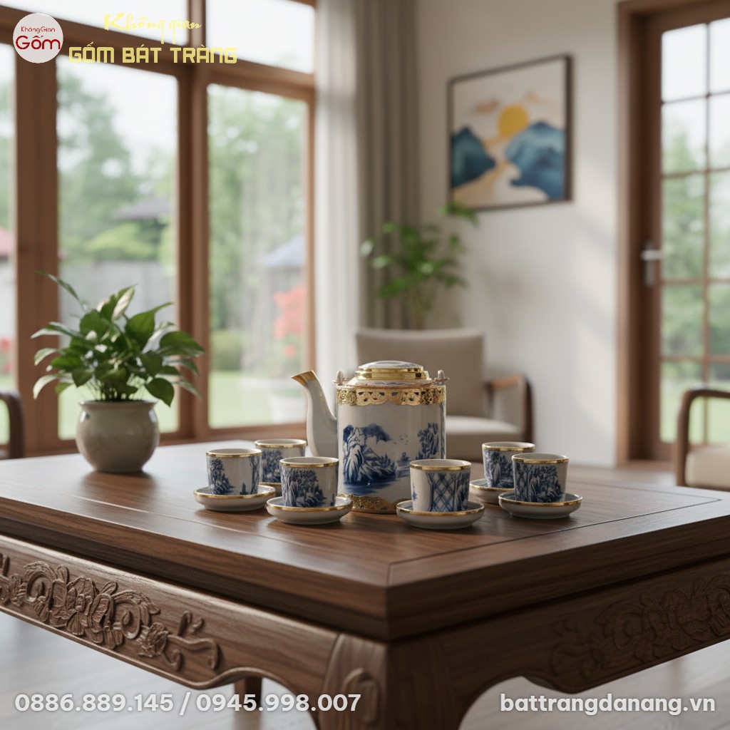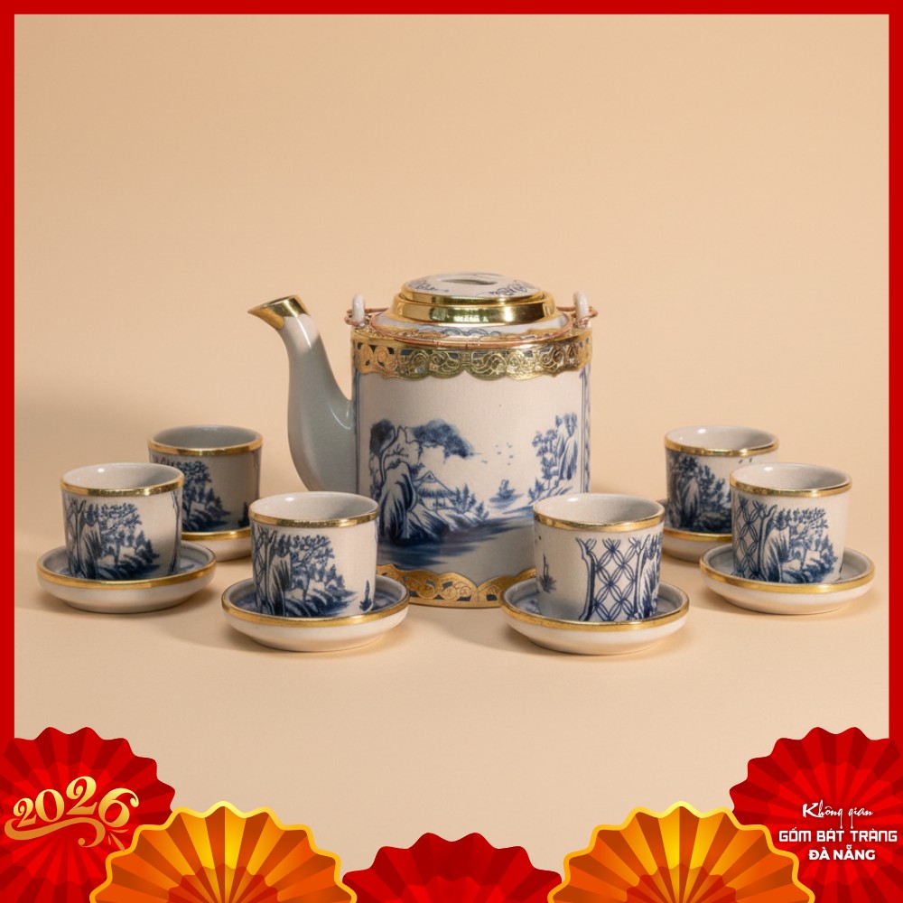 Tuyệt tác gốm sứ Bát Tràng, Bộ Ấm Tích Men Rạn Vẽ Sơn Thủy Bọc Đồng BT-BAT116 là sự hòa quyện giữa nét đẹp hoài cổ và sự tinh xảo thủ công. Với men rạn độc đáo và họa tiết sơn thủy an yên, bộ ấm trà này không chỉ nâng tầm không gian thưởng trà mà còn thể hiện gu thẩm mỹ đẳng cấp của gia chủ.
