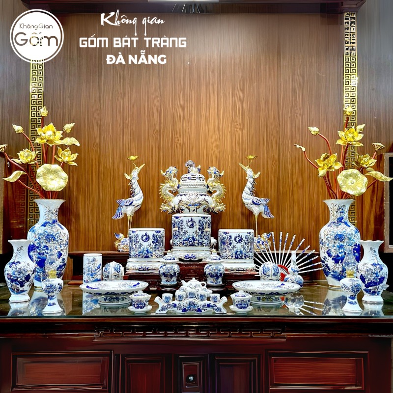 Bộ đồ thờ có đỉnh hạc men lam vẽ vàng hoạ tiết song long liên hoa tại Đà Nẵng BT-BĐT26