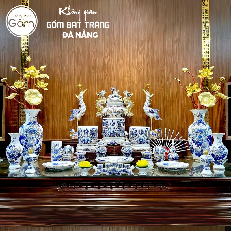 Bộ đồ thờ có đỉnh hạc men lam vẽ vàng hoạ tiết song long liên hoa tại Đà Nẵng BT-BĐT29