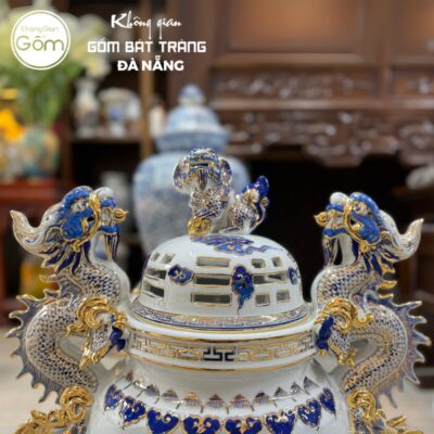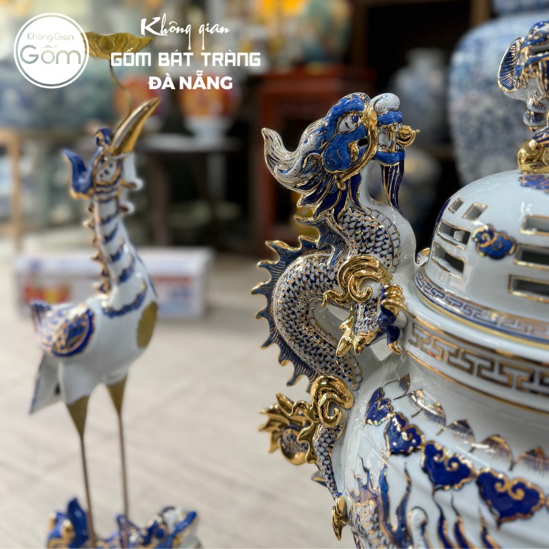 Bộ đồ thờ có đỉnh hạc men lam vẽ vàng hoạ tiết song long liên hoa là sự lựa chọn hoàn hảo để kiến tạo một không gian thờ cúng gia tiên thêm phần trang nghiêm, ấm cúng. Nổi bật trên nền men lam cổ điển là những họa tiết song long và hoa sen được vẽ vàng 24k tinh xảo, sống động, mang lại vẻ đẹp sang trọng và đẳng cấp. Sự kết hợp này không chỉ mang ý nghĩa tâm linh sâu sắc, cầu mong may mắn, bình an cho gia đạo, mà còn thể hiện trọn vẹn tấm lòng thành kính của con cháu đối với ông bà, tổ tiên.