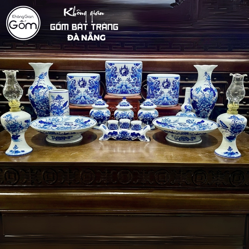 Bộ đồ thờ cúng men lam vẽ tay họa tiết song long và hoa sen bao gồm đầy đủ các vật phẩm cần thiết cho một ban thờ gia tiên trang trọng: