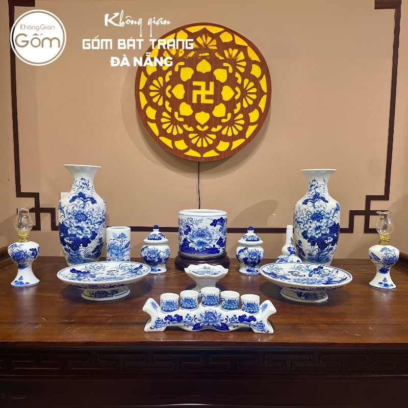 Bộ đồ thờ men lam họa tiết liên hoa là vật phẩm thờ cúng không thể thiếu trên bàn thờ gia tiên, mang đậm giá trị tâm linh sâu sắc và thể hiện lòng thành kính của con cháu đối với ông bà, tổ tiên. Từng món trong bộ đồ thờ đều được chế tác tỉ mỉ, đồng bộ, tạo nên một không gian thờ tự trang nghiêm, ấm cúng và chuẩn phong thủy. Sự hiện diện của bộ đồ thờ cúng cao cấp này góp phần mang lại sự thanh tịnh cho không gian và thể hiện gia phong của gia chủ.