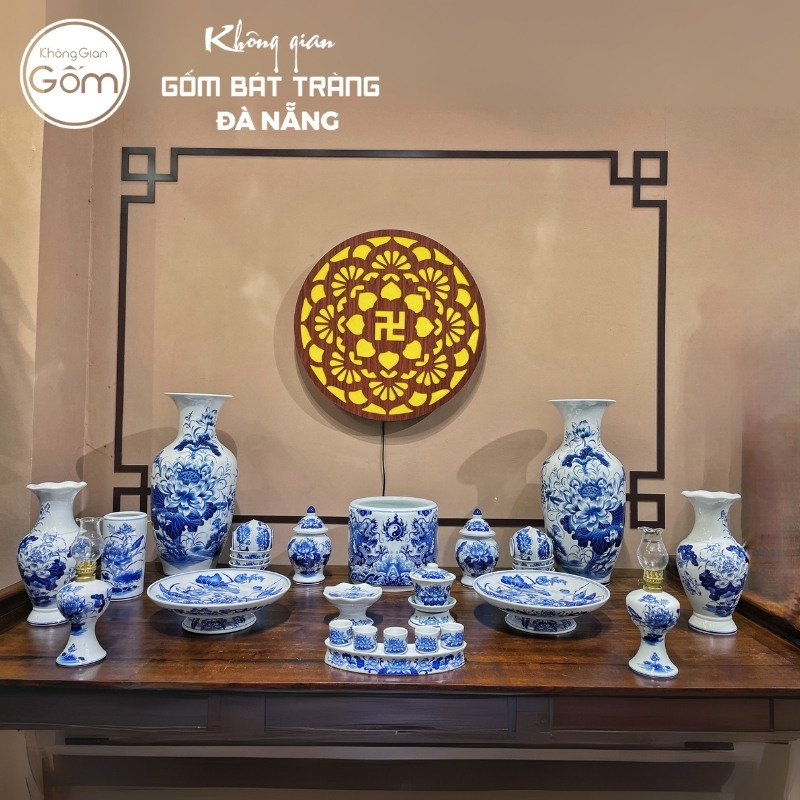 Từng chi tiết nhỏ như kỷ ngai, chóe thờ, đèn dầu hay ống hương đều được chăm chút kỹ lưỡng, tạo nên một bộ đồ thờ đồng bộ, tinh tế. Sự kết hợp giữa màu men lam truyền thống và kiểu dáng đa dạng của từng món đồ không chỉ làm tăng thêm vẻ đẹp mà còn khẳng định sự chu toàn, tấm lòng thành kính của gia chủ dâng lên các bậc bề trên.