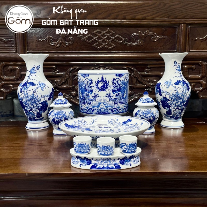 Bộ đồ thờ nổi bật với sắc men lam truyền thống trên nền gốm sứ trắng tinh khiết, tạo nên một vẻ đẹp vừa trang nghiêm, vừa thanh tịnh cho không gian thờ cúng. Màu men lam không chỉ đẹp về mặt thẩm mỹ mà còn mang ý nghĩa về sự tĩnh tại, sâu lắng, giúp gia chủ thể hiện tấm lòng thành kính một cách trọn vẹn nhất.