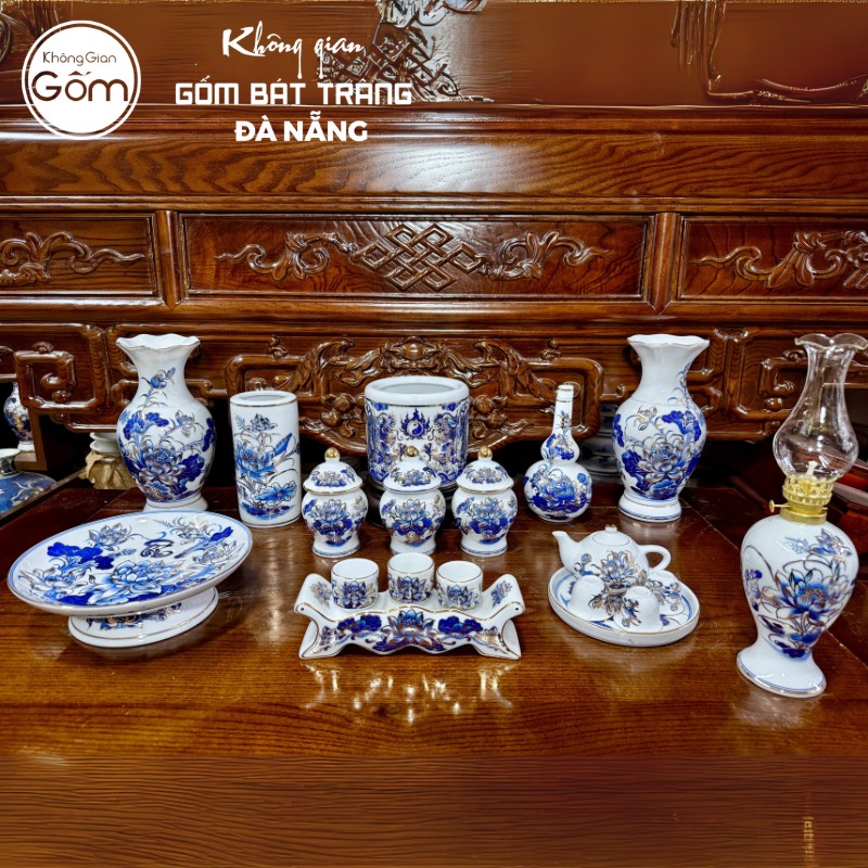 Bộ đồ thờ men lam vẽ vàng họa tiết song long liên hoa là sự lựa chọn hoàn hảo cho không gian thờ cúng của mỗi gia đình Việt. Sự kết hợp hài hòa giữa sắc men lam cổ điển, sâu lắng cùng những đường nét vẽ vàng 24K tinh xảo đã tạo nên một bộ vật phẩm thờ cúng vừa trang trọng, vừa ấm cúng. Họa tiết song long uy nghi kết hợp với đóa sen thanh tịnh không chỉ mang giá trị thẩm mỹ cao mà còn hàm chứa ý nghĩa tâm linh sâu sắc. Qua đó, bộ sản phẩm giúp thể hiện trọn vẹn tấm lòng thành kính của con cháu dâng lên tổ tiên, cầu mong sự hưng thịnh và bình an cho gia đạo.