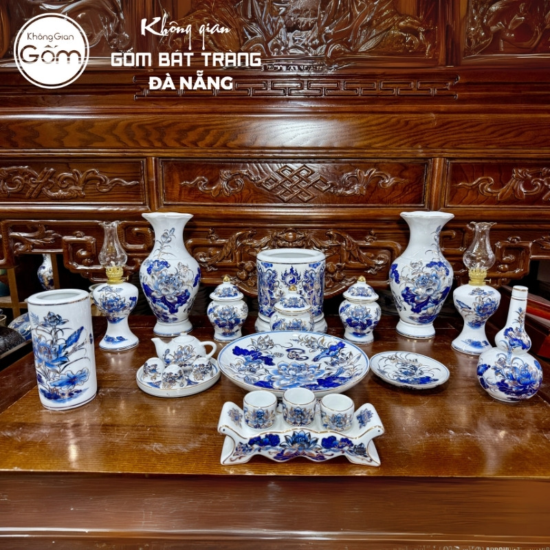 Bộ đồ thờ men lam vẽ vàng họa tiết song long liên hoa là vật phẩm thờ cúng cao cấp, hội tụ tinh hoa của nghệ thuật gốm sứ Bát Tràng. Sản phẩm nổi bật với nước men lam sáng bóng, kết hợp hài hòa cùng những đường nét vẽ vàng 24k tinh tế trên họa tiết hoa sen thanh cao. Sự kết hợp này không chỉ mang đến vẻ đẹp sang trọng, trang nghiêm cho không gian thờ tự mà còn thể hiện tấm lòng thành kính sâu sắc của con cháu đối với tổ tiên. Mỗi vật phẩm đều được chế tác tỉ mỉ, góp phần tạo nên một bàn thờ gia tiên ấm cúng, đủ đầy và trọn vẹn ý nghĩa.