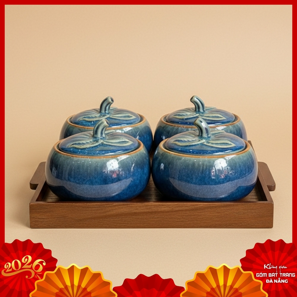 Bộ 4 Hộp Mứt Dáng Bí Men Hỏa Biến Xanh Kèm Khay Gỗ BT-HM25 là biểu tượng của sự tinh tế và sung túc, mang đến một làn gió mới cho không gian đón Tết của mọi gia đình Việt.