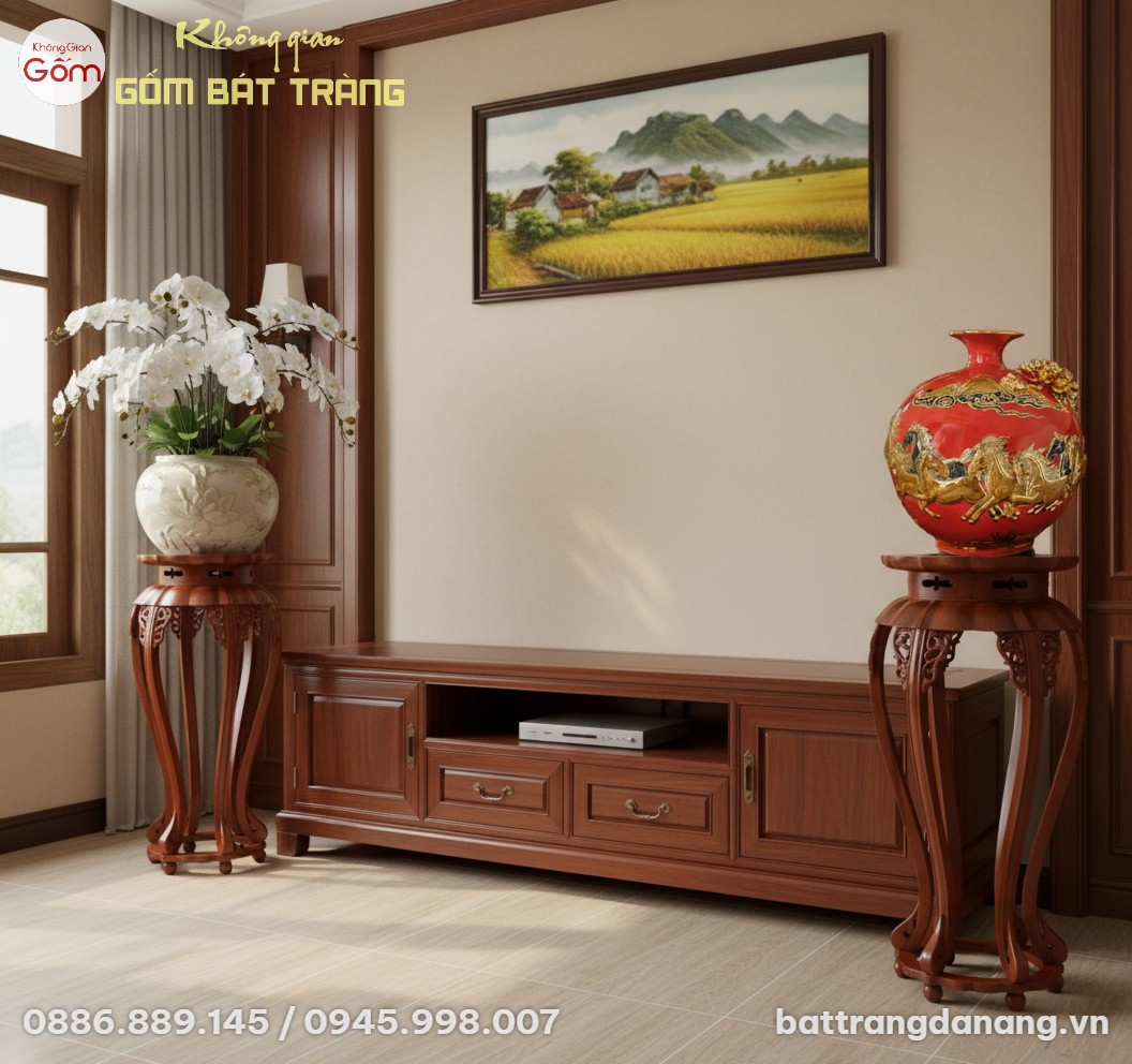 Đôn gỗ dáng cổ điển phù hợp đặt các món đồ gốm sứ trang trí cao cấp, tinh xảo