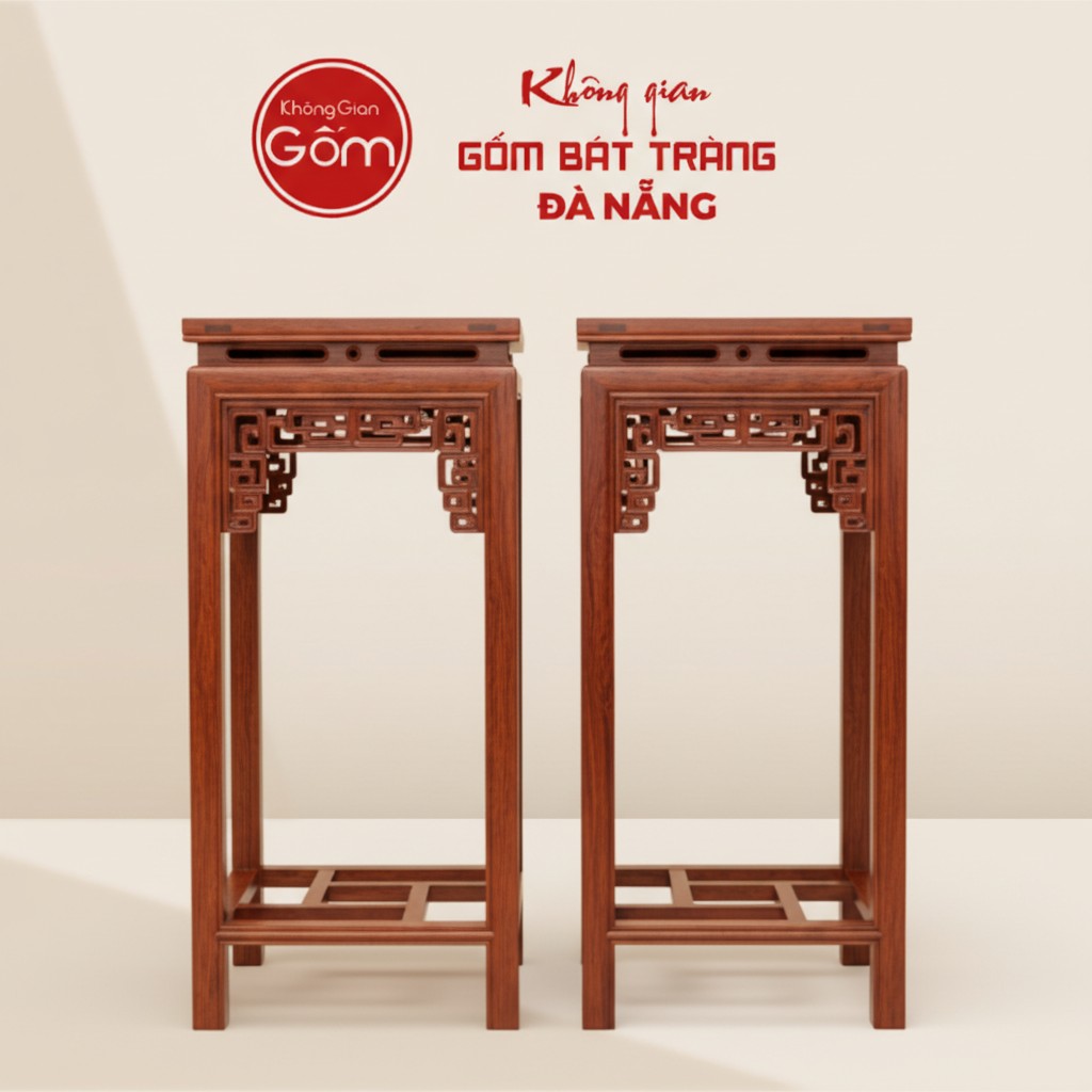 Với kích thước lý tưởng – cao 80cm và mặt vuông 38cm – cặp đôn này có tỷ lệ cân đối, hài hòa, phù hợp để trưng bày nhiều loại vật phẩm. Cấu trúc vững chắc với khung chân và giá đỡ ngang phía dưới mang lại độ bền vượt trội và đảm bảo sự ổn định tuyệt đối khi đặt các vật phẩm quý giá như tượng phong thủy, bình hoa gốm sứ hay cây cảnh nghệ thuật. Thiết kế này giúp sản phẩm trở thành một bệ đỡ hoàn hảo, làm nổi bật giá trị của món đồ được kê lên.
