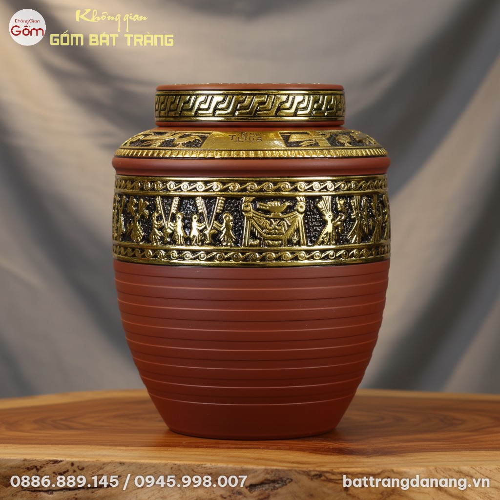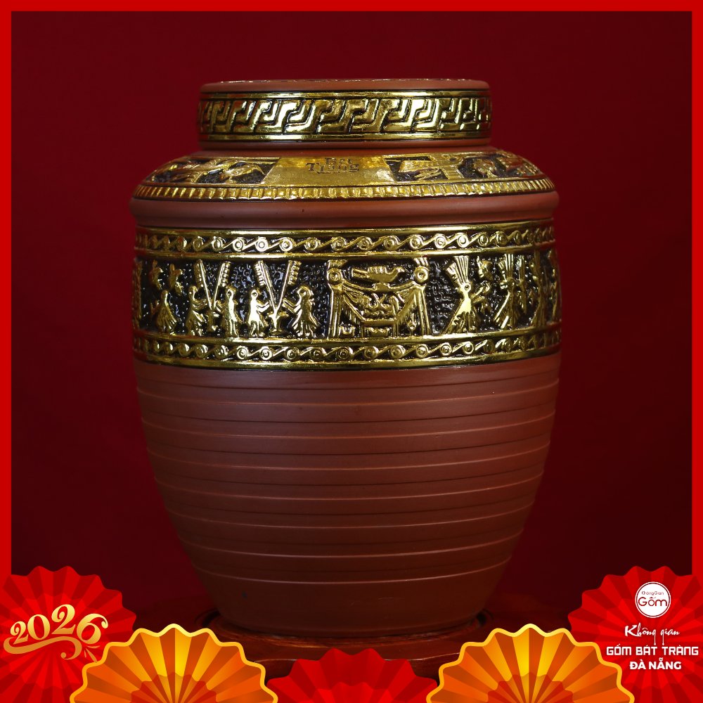 Với chất liệu gốm sành đặc trưng, chiếc chum này phát huy tối đa công năng ngâm ủ, đồng thời khoác lên mình vẻ đẹp cổ kính, hoài niệm với họa tiết Đông Sơn Âu Lạc được khắc nổi và dát vàng tinh xảo.
