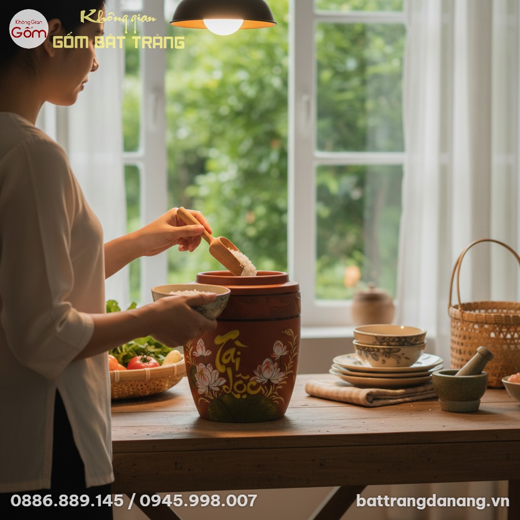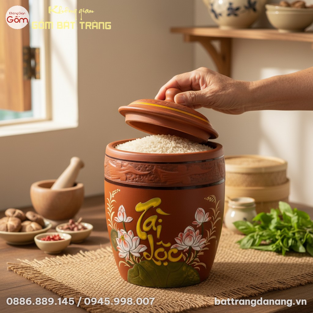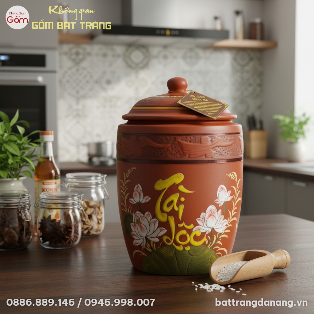 Một trong những đặc tính quan trọng nhất của các sản phẩm chum gạo gốm sứ chính là khả năng bảo quản. Hũ Đựng Gạo Bát Tràng Tài Lộc Hoa Sen được thiết kế với nắp đậy kín, chắc chắn, giúp cách ly gạo khỏi môi trường bên ngoài một cách hiệu quả. Điều này ngăn chặn ẩm mốc, côn trùng xâm nhập, giữ cho từng hạt gạo luôn khô ráo, thơm ngon và đảm bảo vệ sinh an toàn thực phẩm cho cả gia đình.