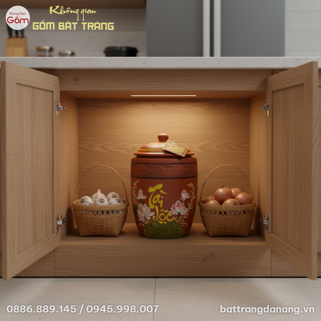 Đặt Hũ Đựng Gạo Tài Lộc Hoa Sen ở những vị trí trang trọng trong gian bếp hoặc phòng ăn giúp không gian thêm gọn gàng, ấm cúng, đồng thời kích hoạt năng lượng phong thủy tích cực. Theo quan niệm dân gian, việc giữ hũ gạo luôn đầy ắp sẽ mang lại sự sung túc, tài lộc liên tục cho gia đình, biểu trưng cho nguồn của cải không bao giờ cạn.
