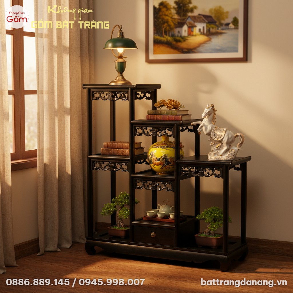 Chiếc kệ này, vượt trên công năng của một món đồ nội thất, lý tưởng để bài trí trong phòng khách, thư phòng hay phòng trà, nơi nó có thể phát huy tối đa vẻ đẹp của mình khi trưng bày những bộ sưu tập gốm sứ tinh xảo hoặc các vật phẩm nghệ thuật.