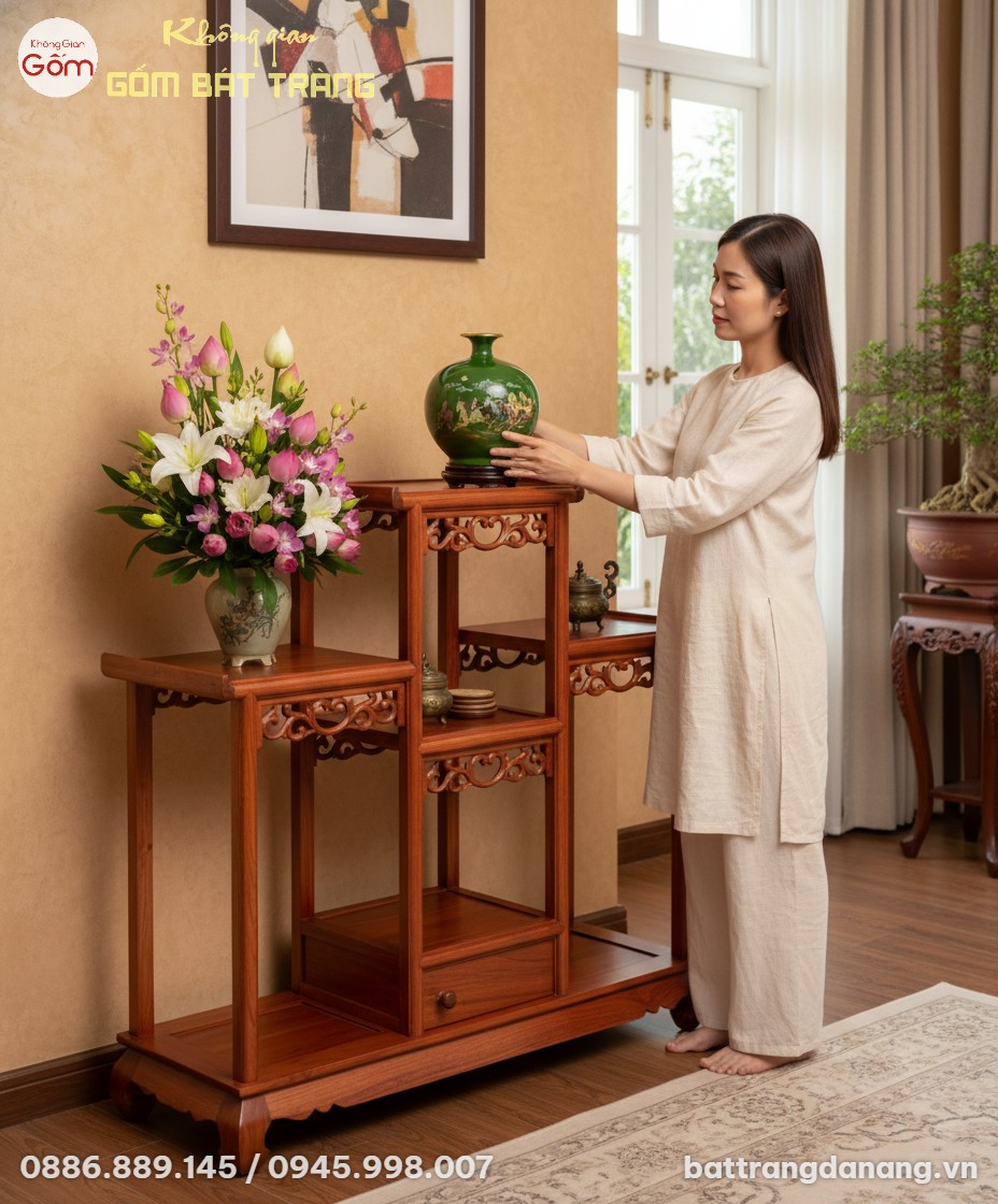 - Phòng khách: Đặt cạnh sofa, dưới cửa sổ hoặc làm vách ngăn hờ, trưng bày bình hoa, tượng nhỏ, sách quý.