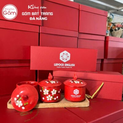 Khay mứt in logo 3 hũ dáng tròn màu đỏ hoạ tiết hoa mai trắng KMQT-04 là một lựa chọn quà tặng doanh nghiệp tinh tế, thể hiện sự tri ân sâu sắc và góp phần quảng bá thương hiệu một cách độc đáo. Bộ sản phẩm này được chế tác từ gốm sứ Bát Tràng danh tiếng, mang sắc đỏ tươi tắn cùng họa tiết hoa mai trắng vẽ tay, gợi lên không khí ấm cúng và may mắn của Tết Việt. Với khả năng cá nhân hóa bằng logo, khay mứt KMQT-04 không chỉ là vật phẩm trang trí bàn tiệc mà còn là sứ giả mang thông điệp gắn kết và thịnh vượng.