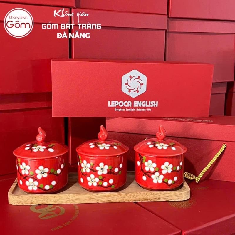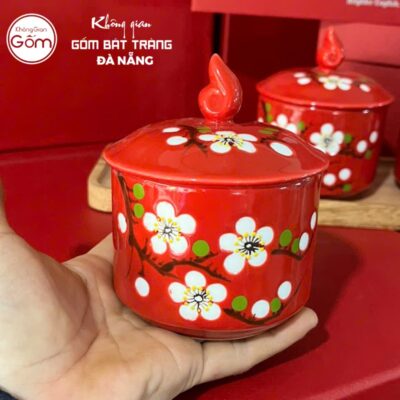 - Màu sắc và họa tiết độc đáo: Nước men đỏ tươi bóng rực rỡ, tượng trưng cho may mắn và tài lộc, là màu sắc chủ đạo của Tết Việt. Họa tiết hoa mai trắng được vẽ tay thủ công tinh xảo, mỗi cánh hoa, mỗi nhụy hoa đều toát lên sự tỉ mỉ và nét đẹp truyền thống.